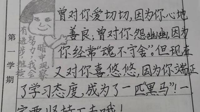 4. 每当我望着小洋洋瞪着亮晶晶的大眼睛认真听讲的可爱模样;看着你端坐书桌前工工整整写作业的专注表情;听你琅琅读书的悦耳声音,我心里有说不出的高兴。我在想:这就是那个刚开学坐不住,总做小动作的孩子吗?才几个月的时间,你就像变了个人,真为你高兴啊,孩子,你能坚持下去吗?老师期盼着下学期你有更大的进步。