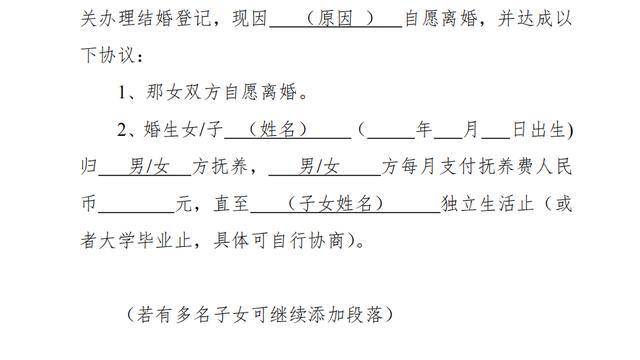 1、双方于×年×月×日生育有一儿子/女儿,取名:×××,离婚后儿子/女儿随男方/女方直接抚养生活,由女方/男方每月给付抚养费(包括生活费、教育费、医疗费)×××元,在每月×号前付清,直到孩子完成高中教育阶段止。高中教育阶段之后的有关费用双方日后重新协商。
