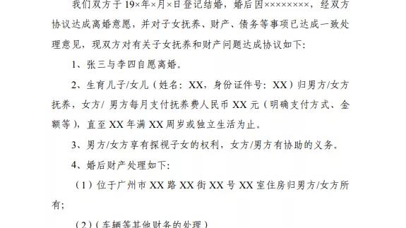 1、上列男女双方经充分协商,达成一致意见签订本离婚协议。