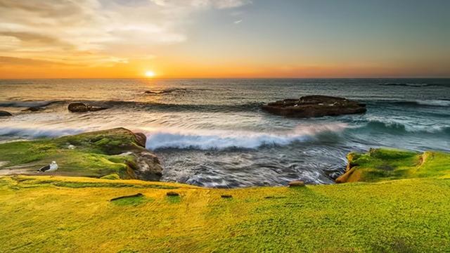 清晨,我们早早地来到了这美丽无比的黄金海岸,为什么要叫它黄金海岸,是因为这片海域沙质细软,海水干净,湛蓝,是日照市唯一未污染的一片海域。天刚蒙蒙亮,海滩上已经站满了人群,大家都在兴奋地等着日出的到来,我也迫不及待地想赶快看到太阳从海岸线上升起的情景。在这时,我发现海滩上有许多黄豆大小的小洞,我正在仔细看着这些小洞时,没想到小洞里竟然有许多小螃蟹,它们挨挨挤挤的从小洞里爬出来,它们这么早从洞里爬出来想做什么呢?难道它们也想观看日出。突然,就在我一不留神的时候,海岸线上出现了一个红彤彤的半圆形,仔细一看,那个就是太阳了,太阳露出了半边脸,仿佛就是睡梦中的小宝宝从妈妈的怀抱中苏醒,向我们大家打招呼。不一会,太阳缓缓的`升到了天空,越升越高,展现出了它那灿烂的笑脸。我都快被陶醉在这个美丽的景色中。